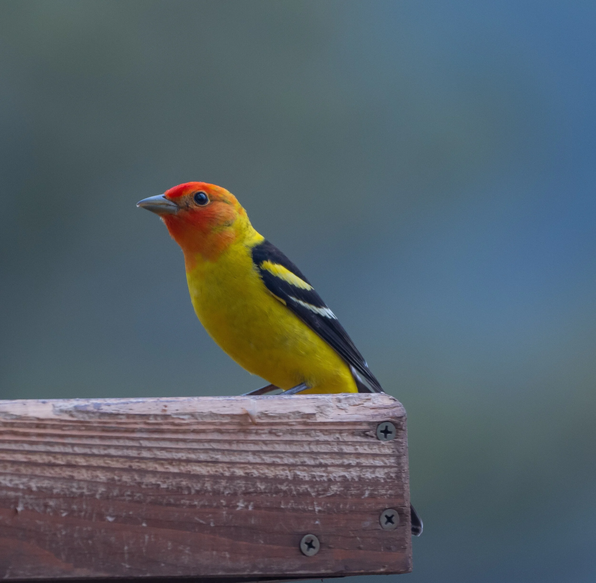 Western Tanagers are a medium-sized songbird that can be found in Montana. They are sparrow-sized and are usually found in higher elevations in conifer forests. Male Western Tanagers are bright red and yellow with black wings. Females are duller, sometimes mostly grayish, with faint yellow on the face and undertail coverts.