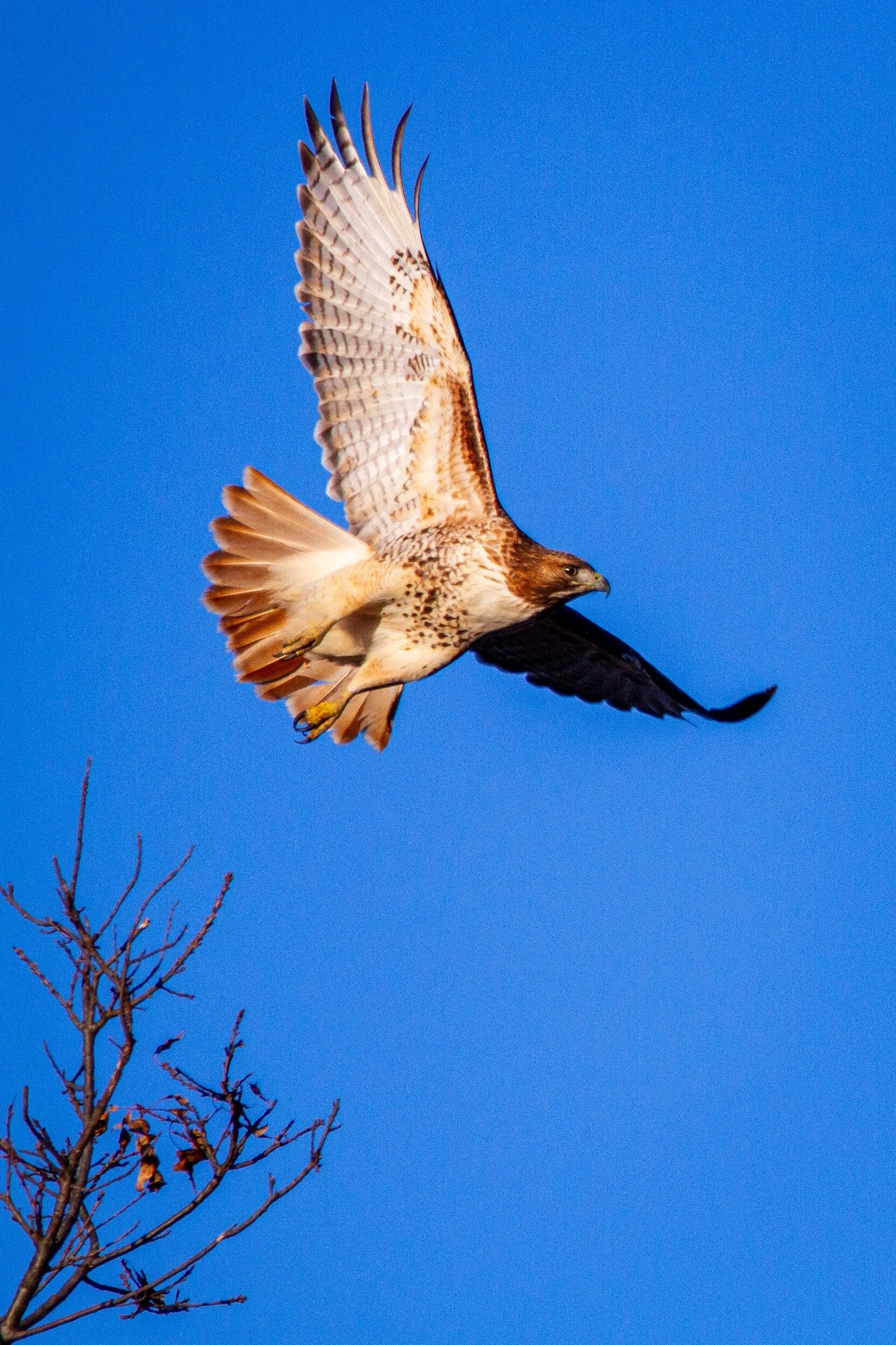 Red-tailed hawks are large birds with broad, rounded wings. They are often seen circling over open fields or perched on telephone poles. They are brown on the back and pale underneath. Krider's Red-tailed Hawks, found in eastern Montana, are a very pale race. They are light mottled brown above and nearly pure white below. Red-tailed hawks have sharp eyesight that is eight times better than a human's.